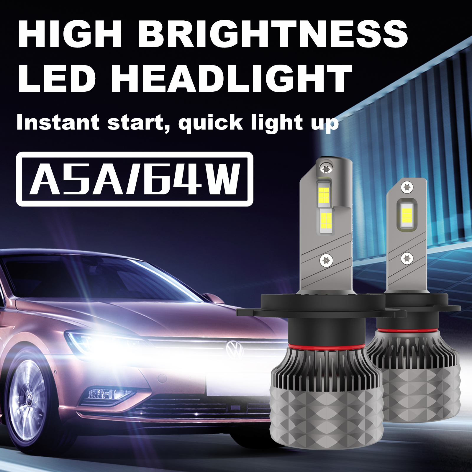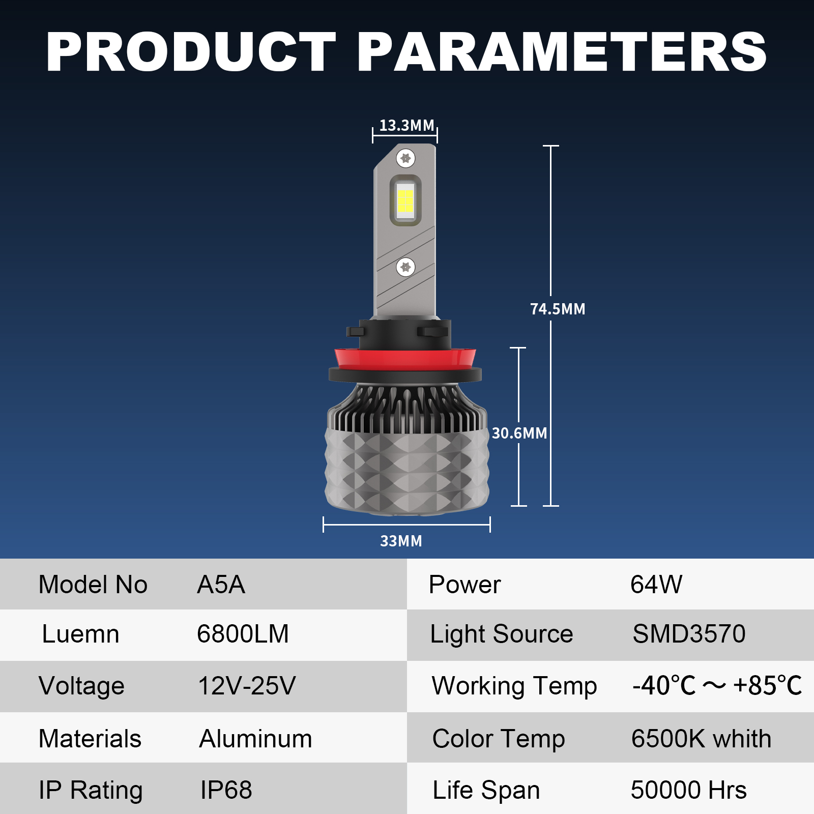A5A 9005/HB3 64W 13600LM 6500K White IP67 LED Headlight Bulbs 2Pcs